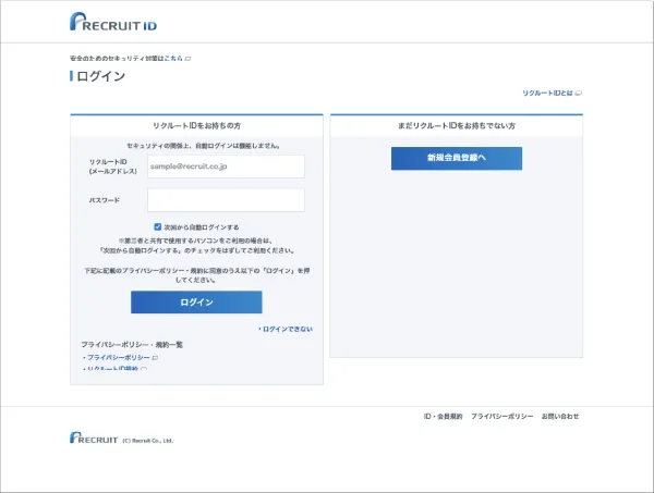 リクルートIDでログインが完了すると、画面右上に登録名が表示されます。
